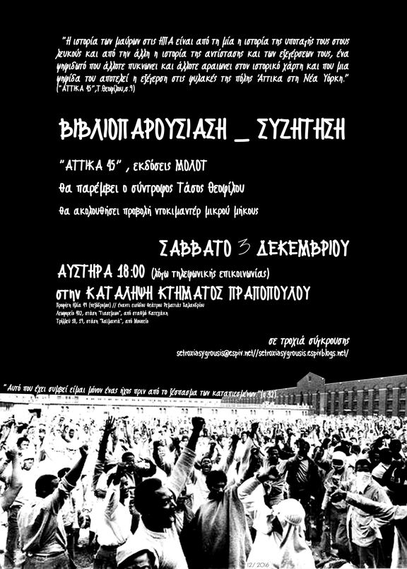 Βιβλιοπαρουσίαση-εκδήλωση του βιβλίου "Άττικα 45", του Τάσου Θεοφίλου, εκδόσεις ΜΟΛΟΤ, το Σάββατο 3/12, στις 18.00, στην κατάληψη κτήματος Πραποπούλου. Η ώρα έναρξης θα τηρηθεί αυστηρά λόγω τηλεφωνικής επικοινωνίας με το σύντροφο. Θα ακολουθήσει προβολή ντοκιμαντέρ μικρού μήκους.