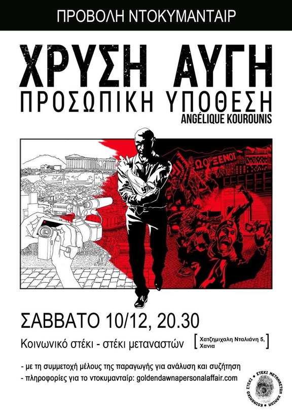 Το Κοινωνικό Στέκι - Στέκι Μεταναστών σας προσκαλεί στην προβολή του ντοκιμαντέρ "Χρυσή Αυγή: Προσωπική Υπόθεση" της Angélique Kourounis το Σάββατο 10 Δεκεμβρίου στις 20:30 στο χώρο του στεκιού χ΄ Μιχάλη Νταλιάνι 5 θα ακολουθήσει συζήτηση με τον Λουκά Σταμέλλο μέλος της παράγωγης