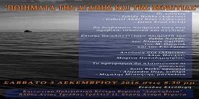 Το Σάββατο, 3 Δεκέμβρη 2016, ώρα 20:30, θα πραγματοποιήσουμε στη Λαμπηδόνα, εκδήλωση αφιερωμένη σε ποιήματα και μουσικές της αγάπης και της ξενιτιάς.