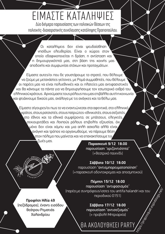 Κατάληψη Κτήματος Πραποπούλου Προφήτη Ηλία 49 απέναντι από την είσοδο του Θεάτρου Ρεματιάς Λεωφορείο 402: στάση "Γιασεμιών" Τρόλλευ: 18 και 19
