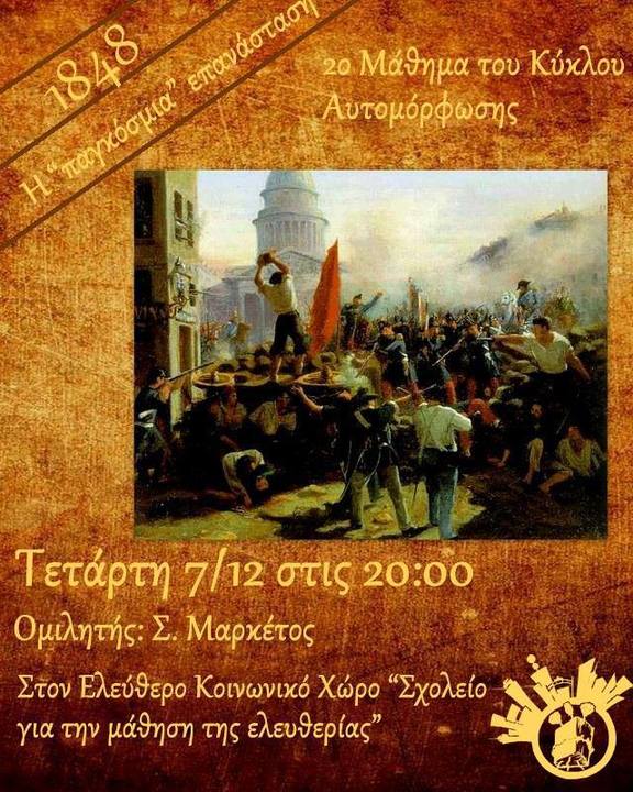 Την Τετάρτη 7/12 στις 20:00 (αυστηρά) θα πραγματοποιηθεί το 2ο μάθημα του Κύκλου Αυτομόρφωσης στον ΕΚΧ "Σχολείο για την μάθηση της ελευθερίας".