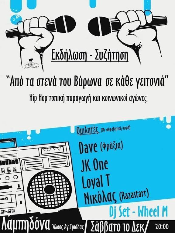 To Σάββατο 10 Δεκεμβρίου διοργανώνουμε εκδήλωση/συζήτηση για το hip hop: Από τα στενά του Βύρωνα, σε κάθε γειτονιά. Hip hop τοπική παραγωγή και κοινωνικοί αγώνες.
