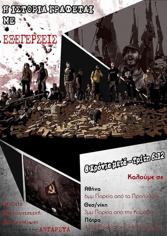 8 χρόνια συμπληρώνονται απ' τη δολοφονία του 15χρονου Αλέξη Γρηγορόπουλου, από το πιστόλι του δολοφόνου-αστυνομικού Κορκονέα και του συνεργού του Σαραλιώτη. H δολοφονία πυροδότησε μια νεολαιίστικη εξέγερση ενάντια σ' ολόκληρο το πολιτικό σύστημα, την τότε κυβέρνηση της ΝΔ, την αστυνομία. Παρά την άγρια καταστολή των κινητοποιήσεων και την αισχρή συκοφάντηση των ΜΜΕξαπάτησης, η εξέγερση των μαθητών και της νεολαίας είχε την στήριξη της κοινωνίας. Εξέφρασε όλη την συσσωρευμένη αγανάκτηση των νέων και των εργαζομένων ενάντια στο σάπιο αστικό σύστημα και τον κρατικό μηχανισμό καταστολής. Ο «Δεκέμβρης» ήταν μόνο μία «εικόνα από το μέλλον», καθώς 2 χρόνια μετά είχαμε και την επίσημη κήρυξη ενός ολοκληρωτικού πολέμου ενάντια στους εργαζόμενους και τη νεολαία από την τρόικα και το μνημονιακό μπλοκ. Ήταν ο προάγγελος των μεγάλων κοινωνικών αγώνων και συγκρούσεων που ακολούθησαν: 5 Μάη 2010, κίνημα πλατειών και απεργία 28-29 Ιούνη 2011, απεργία 12 Φλεβάρη 2012, Κερατέα, Σκουριές κ.ά.