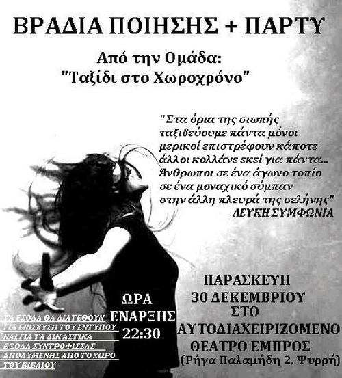 ΠΟΙΗΤΙΚΗ ΒΡΑΔΙΑ ΚΑΙ ΠΑΡΤΥ ΑΠΟ ΤΗΝ ΟΜΑΔΑ ΤΑΞΙΔΙ ΣΤΟ ΧΩΡΟΧΡΟΝΟ ΓΙΑ ΤΑ ΔΙΚΑΣΤΙΚΑ ΕΞΟΔΑ ΦΙΛΗΣ,ΣΥΝΤΡΟΦΙΣΑΣ ΚΑΙ ΜΕΛΟΣ ΤΟΥ ΕΝΤΥΠΟΥ ΑΠΟΛΥΜΕΝΗΣ ΑΠΟ ΤΟΝ ΧΩΡΟ ΤΟΥ ΒΙΒΛΙΟΥ,ΚΑΘΩΣ ΚΑΙ ΓΙΑ ΤΗΝ ΕΝΙΣΧΥΣΗ ΕΚΔΟΣΗΣ ΤΟΥ ΕΝΤΥΠΟΥ.