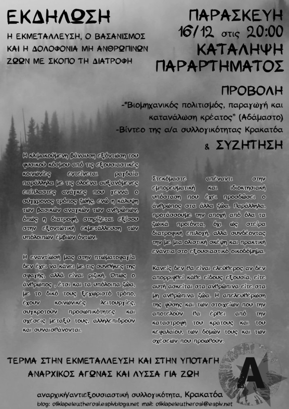 Την Παρασκευή 16/12 στις 20:00 θα πραγματοποιηθεί στην Κατάληψη Παραρτήματος εκδήλωση με θέμα την εκμετάλλευση,το βασανισμό και τη δολοφονία μη ανθρώπινων ζώων με σκοπό τη διατροφή. Θα προβληθούν δύο βίντεο, το ένα της συλλογικότητάς μας και το άλλο από το αναρχικό έντυπο Αδάμαστο με τίτλο "Βιομηχανικός πολιτισμός, παραγωγή και κατανάλωση κρέατος". Θα ακολουθήσει συζήτηση.