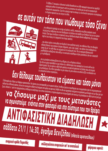 Γνωρίζοντας βέβαια πολύ καλά ότι καμιά θεσμική απάντηση, εφόσον και όταν αυτή δίνεται, δεν είναι από μόνη της αρκετή για την αποδυνάμωση των φασιστικών πρακτικών, γνωρίζοντας ότι κανένας αντιφασιστικός αγώνας δεν μπορεί να είναι αποτελεσματικός, αν δεν γίνει υπόθεση των κινημάτων και της εργατικής τάξης, αν δεν γίνει υπόθεση δική μας, επιβάλλεται να είμαστε όλες και όλο στην αντιφασιστική κινητοποίηση στις 21/1 (14:30, άγαλμα Βενιζέλου) για να μην επιτρέψουμε στους φασίστες να χύσουν το δηλητήριό τους στους δρόμους της πόλης.