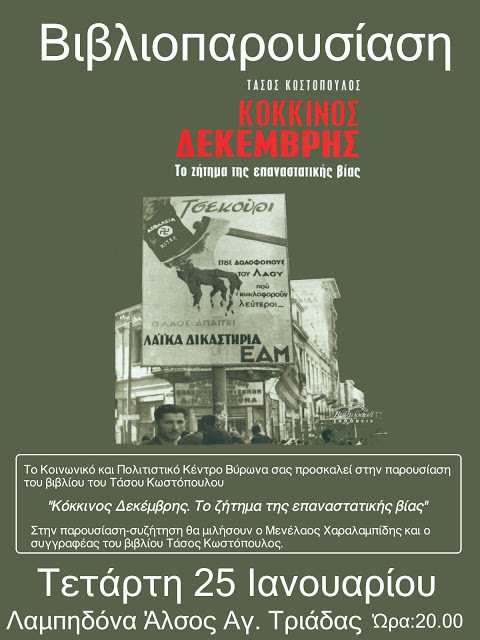 "Κόκκινος Δεκέμβρης" του Τ. Κωστόπουλου: βιβλιοπαρουσίαση, Τετάρτη 25 Γενάρη, 8 μ.μ.