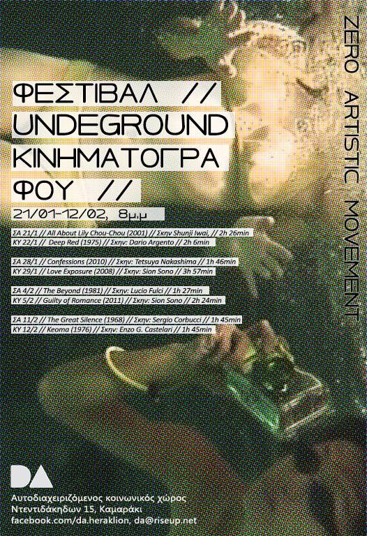 Το Zero Artistic Movement διοργανώνει κύκλου προβολών από 21-01 έως 12-02 στον αυτοδιαχειριζόμενο κοινωνικό χώρο DA στο Ηράκλειο Κρήτης με θεματική τον Underground - και σχετικά άγνωστο - κινηματογράφο.