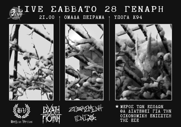 Σε μία βδομάδα από σήμερα, το Σάββατο 28/1 στις 21:00, παίζουμε μπαλίτσα και πάλι σε hardcore/punk υπόγειες αλάνες, παρέα με τους Έσχατη Ποινή, Bellum Veritas & Ξεχασμένη Γενιά!