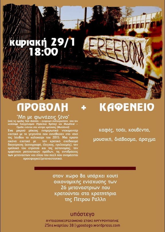 Προβολή του ντοκιμαντέρ «Μη με φωνάζεις ξένο» [από τις ομάδες Sine dominis - αναρχική συλλογικότητα απο την κατάληψη Ευαγγελισμού (Ηράκλειο Κρήτης) και Musaferat - Ομάδα ενάντια στα κέντρα κράτησης (Μυτιλήνη)]