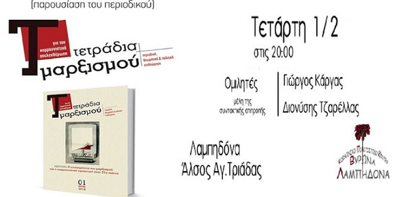 Το Κοινωνικό Πολιτιστικό Κέντρο Βύρωνα σας προσκαλεί στην παρουσίαση του περιοδικού Τετράδια Μαρξισμού για την κομμουνιστική απελευθέρωση την Τετάρτη 1 Φεβρουαρίου 2017 στις 20.00 στη Λαμπηδόνα. Στην παρουσίαση-συζήτηση θα μιλήσουν τα μέλη της συντακτικής επιτροπής του περιοδικού Γιώργος Κάργας και Διονύσης Τζαρέλλας.