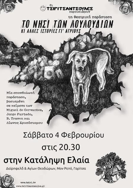 Το Σάββατο 4 Φλεβάρη και ώρα 20.30 στην κατάληψη Ελαία οι Τσιριτσάντσουλες θα παρουσιάσουν τη θεατρική τους παράσταση "ΤΟ ΝΗΣΙ ΤΩΝ ΛΟΥΛΟΥΔΙΩΝ ΚΙ ΑΛΛΕΣ ΙΣΤΟΡΙΕΣ ΓΙΆΓΡΙΟΥΣ"