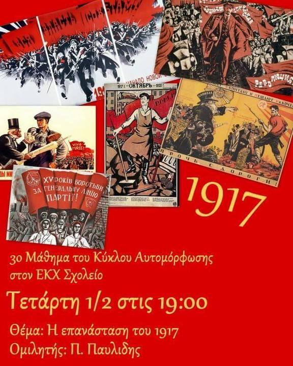 Την Τετάρτη 1/2 στις 7μμ θα διεξαχθεί, στο χώρο του εκχ Σχολείο, το τρίτο μάθημα του κύκλου αυτομόρφωσης με θέμα την επανάσταση του 1917. Ομιλητής θα είναι ο Περικλής Παυλίδης, καθηγητής φιλοσοφίας της παιδείας στο ΠΤΔΕ του ΑΠΘ.