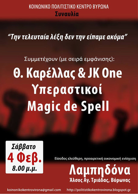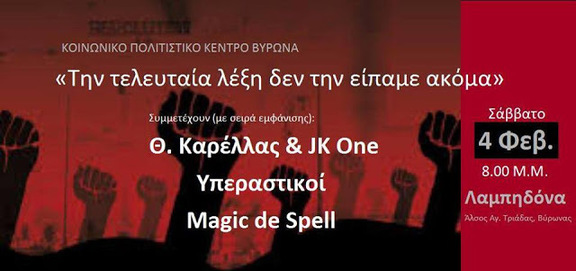 Το Σάββατο 4 Φεβρουαρίου το Κοινωνικό Πολιτιστικό Κέντρο Βύρωνα διοργανώνει συναυλία σύγχρονου πολιτικού τραγουδιού με τίτλο "Την τελευταία λέξη δεν την είπαμε ακόμα". Συμμετέχουν καλλιτέχνες, που έχουν συνδεθεί με τους κοινωνικούς και εργατικούς αγώνες των τελευταίων χρόνων με την παρουσία και το έργο τους.