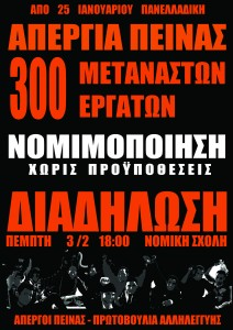 Την ίδια ημέρα, Πέμπτη 3 Φεβρουαρίου, 18.00 το απόγευμα, στη Νομική (Πνευματικό Κέντρο - Ακαδημίας) καλούμε σε διαδήλωση για τη Νομιμοποίηση όλων των Μεταναστών και την Αλληλεγγύη στους 300 απεργούς πείνας.