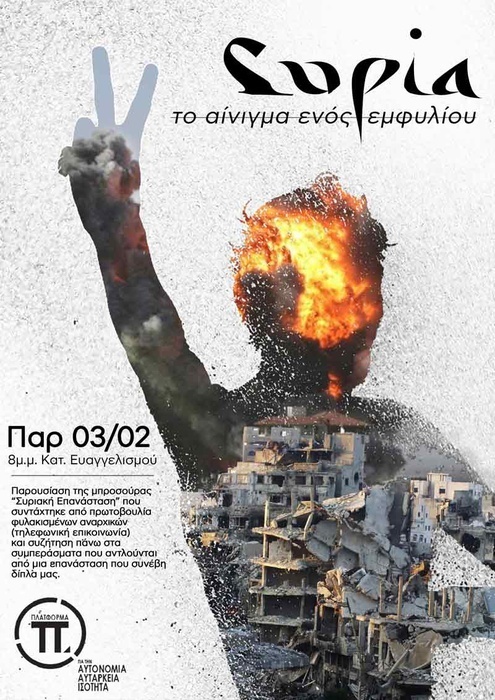 Την Παρασκευή, 3 Φεβρουαρίου σας προσκαλούμε στην παρουσίαση της μπροσούρας "ΣΥΡΙΑΚΗ ΕΠΑΝΑΣΤΑΣΗ" η οποία συντάχτηκε στις φυλακές Κορυδαλλού από πρωτοβουλία φυλακισμένων αναρχικών. Η μπροσούρα αυτή αποτελεί ένα δυνατό και πλήρες εργαλείο ανάλυσης αλλά και μια σημαντική παρακαταθήκη ως προς την ροή των γεγονότων από μια αντιεξουσιαστική σκοπιά.