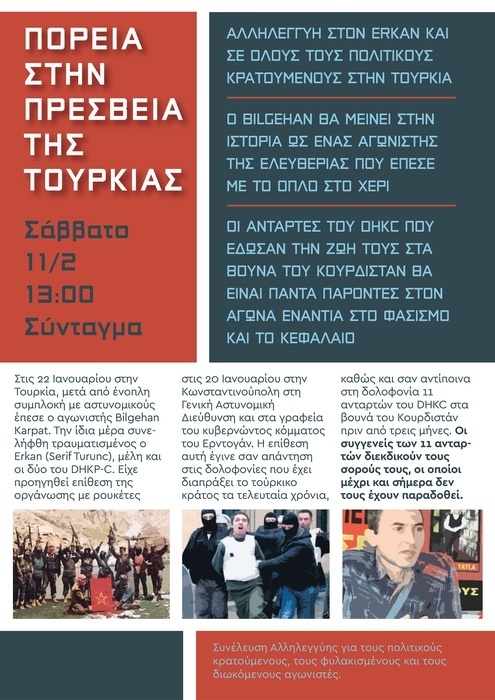 Κάλεσμα για συμμετοχή στην πορεία στην πρεσβεία της Τουρκίας το Σάββατο 11 Φλεβάρη, Συγκέντρωση στο Σύνταγμα, στις 13:00