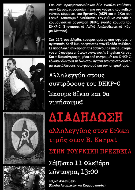 Στις 20 του Γενάρη η κομμουνιστική οργάνωση DHKC επιτέθηκε ένοπλα στα γραφεία του κόμματος του Ερντογάν και στο αρχηγείο της αστυνομίας. 2 μέρες μετά αυτές τις επιθέσεις ο σύντροφος Bilgehan Karpat έπεσε νεκρός από τις σφαίρες των Τούρκων μπάτσων, ενώ ό σύντροφος Serif Turunc (γνωστός στην Ελλάδα με το όνομα Erkan) τραυματίστηκε κι έπεσε στα χέρια του Τουρκικού κράτους.