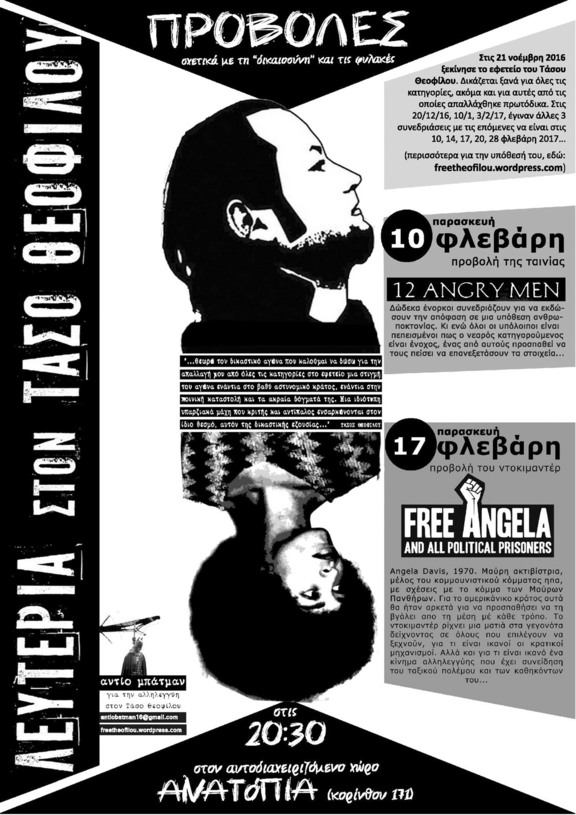 …στις 20.30. Η προβολή γίνεται από το «αντίο μπάτμαν» στο πλαίσιο κινήσεων αλληλεγγύης στον Τάσο Θεοφίλου. Την άλλη βδομάδα (παρασκευή 17 φλεβάρη) θα γίνει προβολή της ταινίας «Free Angela and all political prisoners».
