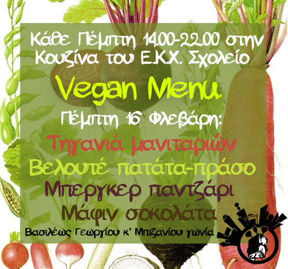Η κουζίνα του Ε.Κ.Χ. Σχολείο όπως και κάθε Πέμπτη προσφέρει γεύματα που δεν εμπεριέχουν ως συστατικό τον φόνο, τον βιασμό και τον βασανισμό αθώων πλασμάτων. Ελάτε να περάσουμε μια αναίμακτη Τσικνοπέμπτη χωρίς εκμετάλλευση!