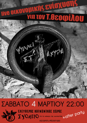 Το Σάββατο 4/3 στις 22:00 θα γίνει live οικονομικής ενίσχυσης για τα δικαστικά έξοδα τοου Τ.Θεοφίλου, με τους "Ψυλλοι στ'άχυρα". Μετά θα ακολουθήσει party.