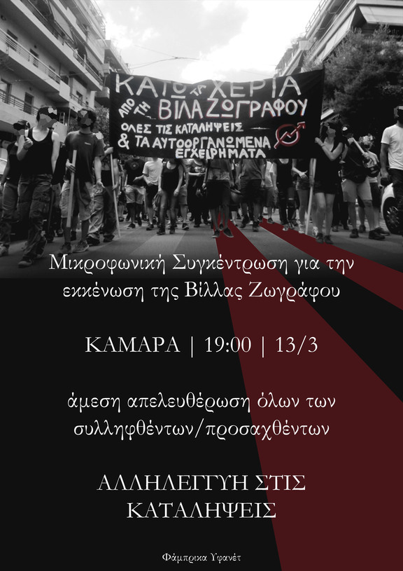 Είναι γνωστό ότι η εξουσία εκδικείται όσους/ες την αμφισβητούν και αντιστέκονται στην απόλυτη υποταγή υψώνοντας τις φωνές τους, έτσι τα ξημερώματα Δευτέρας 13/3 αστυνομικές δυνάμεις εισέβαλαν στην κατάληψη Βίλα Ζωγράφου. Μέσα στην κατάληψη βρίσκονταν σύντροφοι/ισσες, οι οποίες/οι ανέλαβαν την πολιτική ευθύνη για την υπεράσπιση αυτής.