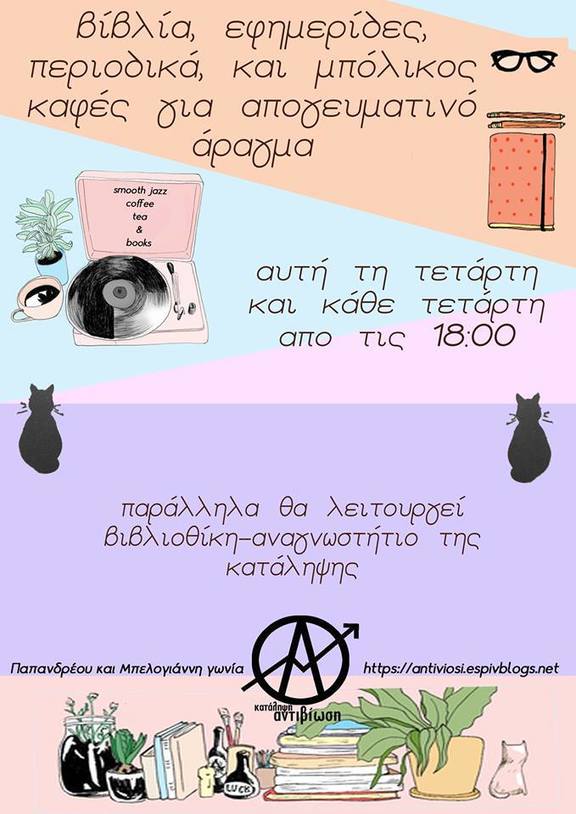 Βιβλία, εφημερίδες, περιοδικά, μπόλικος καφές και τσάι θα χαρακτηρίζουν τις Τετάρτες μας στην κατάληψη Αντιβίωση. Κάθε Τετάρτη από τις 18:00 ο χώρος της κατάληψης θα ανοίγει. Μπορείς να φέρεις το βιβλίο σου, να διαβάσεις ή και να αράξεις απλά. Παράλληλα θα λειτουργεί στην κατάληψη και βιβλιοθήκη-αναγνωστήριο.Θα υπάρχουν λογής λογής καφέδες, τσάγια και άλλα ροφήματα…