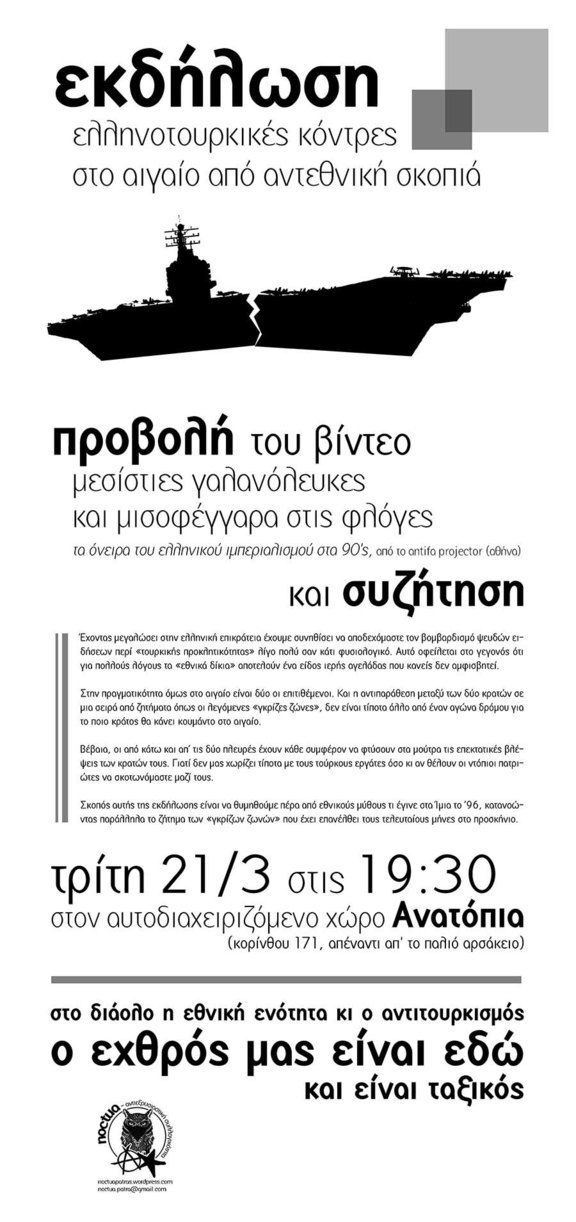 Εκδήλωση: Ελληνοτούρκικες κόντρες στο αιγαίο απο αντεθνική σκοπιά