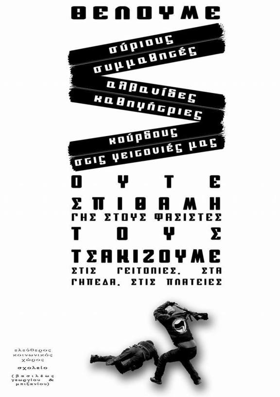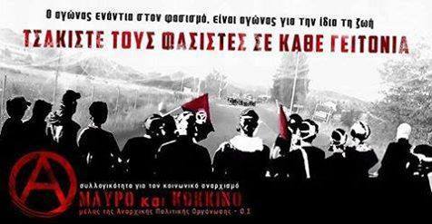Την ίδια ώρα η κυβέρνηση ΣΥΡΙΖΑ-ΑΝΕΛ από τη μία συναγελάζεται όπου σταθεί και όπου βρεθεί με τους ναζιστές δολοφόνους της Χρυσής Αυγής, όπως πρόσφατα στα Ιωάννινα, και από την άλλη ο εκτελεστικός βραχίονας του κράτους χτυπάει και συλλαμβάνει αντιφασίστες αναρχικούς. Από τη μία η κυβέρνηση εκκενώνει καταλήψεις, συνεχίζοντας την επίθεση που ξεκίνησε το καλοκαίρι με την εκκένωση των τριών καταλήψεων στέγης μεταναστ(ρι)ών στη Θεσσαλονίκη, και από την άλλη κάνει πλάτες στους φασίστες του Ιερού Λόχου και της Πατριωτικής Κίνησης Ωραιοκάστρου, δηλαδή σε κυνηγούς παιδιών μεταναστών και προσφύγων, κινητοποιώντας τον κατασταλτικό μηχανισμό για την προστασία τους.