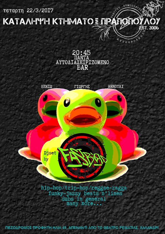 Κατάληψη Κτήματος Πραποπούλου Προφήτη Ηλία 49 απέναντι από την είσοδο του Θεάτρου Ρεματιάς Λεωφορείο 402: στάση "Γιασεμιών" Τρόλλευ: 18 και 19