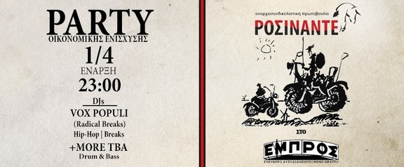 Πάρτι οικονομικής ενίσχυσης της Αναρχοσυνδικαλιστικής Πρωτοβουλίας Ροσινάντε, στο ελεύθερο αυτοδιαχειριζόμενο θέατρο Εμπρός(Ρήγα Παλαμίδου 2, Ψυρρή), το Σάββατο 1 Απρίλη στις 23:00.