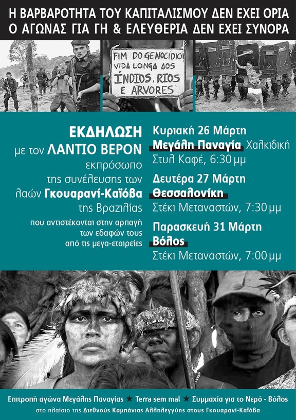 Εκδηλώσεις ενημέρωσης και αλληλεγγύης με τον Λάντιο Βερόν, εκπρόσωπο της συνέλευσης των λαών Γκουαρανί - Καϊοβά της Βραζιλίας, την Κυριακή 26 Μαρτίου στη Μεγάλη Παναγιά Χαλκιδικής (Στυλ Καφέ, 6.30 μμ), τη Δευτέρα 27 Μαρτίου στη Θεσσαλονίκη (Στέκι Μεταναστών, 7.30 μμ) και την Παρασκευή 31 Μαρτίου στο Βόλο (Στέκι Μεταναστών, 7.00 μμ).