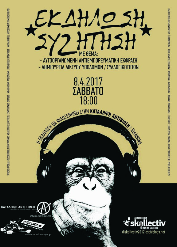 Το Σάββατο 8/4/2017 και ώρα 18:00 θα φιλοξενηθεί στην Κατάληψη Αντιβίωση (Παπανδρέου & Μπελογιάννη γωνία) Εκδήλωση/Συζήτηση από την μουσική κολεκτίβα ΔΙΣΚΟΚΟΠΤΕΙΟΝ DiskollectiV με θέμα: (α) αυτοοργανωμένη αντιεμπορευματική έκφραση, (β) δημιουργία δικτύου υποδομών/συλλογικοτήτων.