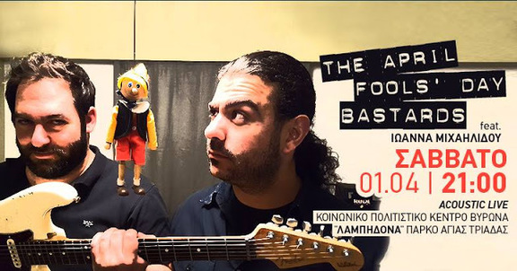 Οι Διαμαντής Διαμαντίδης και Λευτέρης Πουλιού ανηφορίζουν ανήμερα Πρωταπριλιά προς το φιλόξενο Κοινωνικό Πολιτιστικό Κέντρο Βύρωνα, τη γνώριμή μας "Λαμπηδόνα" στο Άλσος της Αγίας Τριάδας, για να συναντήσουν για ακόμα μία φορά για φέτος τη σπουδαία τραγουδίστρια Ιωάννα Μιχαηλίδου, σ' ένα πρόγραμμα με τραγούδια της Μητέρας Φάλαινας Τυφλής (γκρουπ στο οποίο έχουν συνυπάρξει οι "Μπάσταρδοι"), αλλά και γνωστές και άγνωστες εκδοχές τραγουδιών από το εγχώριο και διεθνές ρεπερτόριο. Επιπλέον, να που προκύπτει εκείνο το βράδυ τριπλή "γενέθλια" σύμπραξη-έκπληξη, οπότε αυτή η Πρωταπριλιά... ΔΕΝ ΧΑΝΕΤΑΙ!