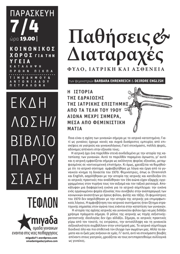 Την Παρασκευή 7/4 στις 19:00 ο Κοινωνικός χώρος για την Υγεία, φιλοξενεί την παρουσίαση του βιβλίου "Παθήσεις και Διαταραχές - Φύλο, Ιατρική και Ασθένεια" των φεμινιστριών BARBARA EHRENREICH & DEIRDRE ENGLISH, μια έκδοση του Αρχείου 71 σε συνεργασία με το περιοδικό Τεφλόν και πρόλογο από τη γυναικεία ομάδα mιγaδa.