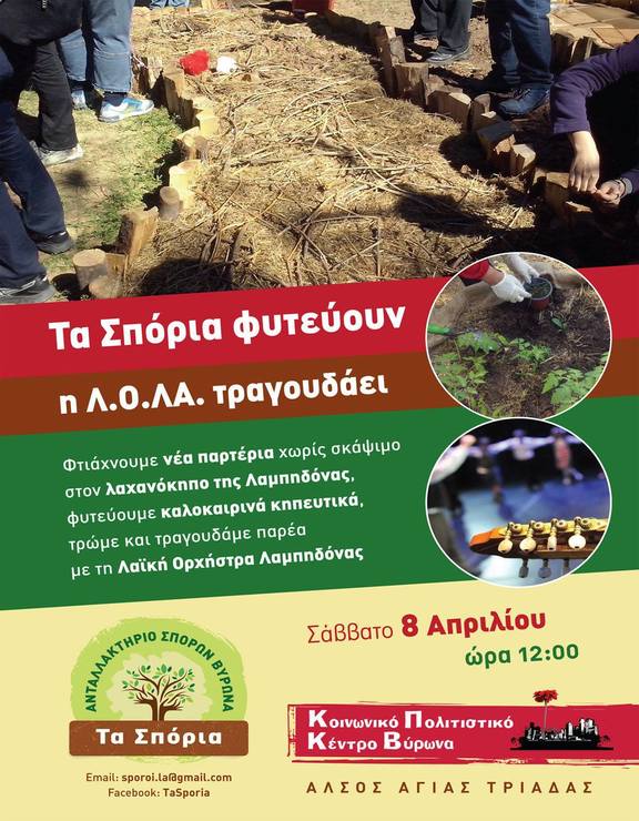 Σας περιμένουμε το Σάββατο 8 Απριλίου 2017 στις 12:00 το μεσημέρι στο Κοινωνικό Πολιτιστικό Κέντρο Βύρωνα - Λαμπηδόνα, στο Άλσος της Αγίας Τριάδας για να (συν)καλλιεργήσουμε μέσα από ένα πρακτικό εργαστήρι κατασκευής υπερυψωμένων παρτεριών (lasagna gardening) και φύτευσης καλοκαιρινών κηπευτικών αλλά και να φάμε στην κουζίνα αλληλεγγύης της Λαμπηδόνας και να τραγουδήσουμε παρέα με τη Λ.Ο.ΛΑ.
