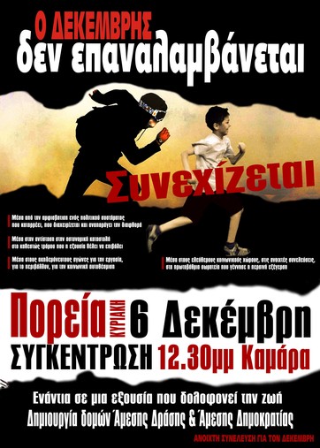 Παρόλο που η εκάστοτε εξουσία προσπαθεί να μετατρέψει την κοινωνική οργή σε επετειακή φιέστα, κάτι που το θυμόμαστε μια φορά το χρόνο, για μας ο χρόνος δεν έχει σταματήσει. Καθ'όλη τη διάρκεια της χρονιάς, λαϊκές συνελεύσεις σε γειτονιές, αυτόνομα σωματεία, αυτοδιαχειριζόμενοι χώροι, και κόσμος στο δρόμο μας θυμίζουν αυτό που ούτως ή άλλως δεν ξεχνάμε. Οτι υπάρχει ένας άλλος τρόπος να διαχειριζόμαστε τις ζωές μας μακρυά από κόμματα, και ιεραρχία, χωρίς διαμεσολάβηση, πρόσωπο με πρόσωπο, με άμεση δημοκρατία, με άμεσες δράσεις.