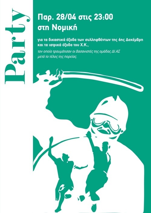 Πάρτυ οικονομικής ενίσχυσης για τα δικαστικά έξοδα των συλληφθέντων της 6ης Δεκέμβρη και τα ιατρικά έξοδα του Χ.Κ., τον οποίο τραυμάτισαν οι βασανιστές της ομάδας ΔΙ.ΑΣ μετά το τέλος της πορείας σπάζοντας του το γόνατο