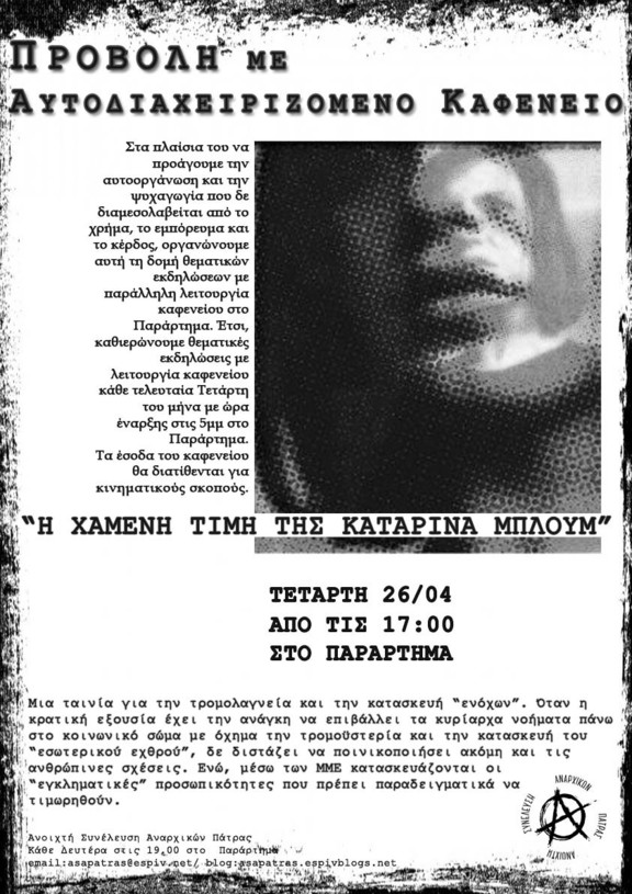 Προβολή της ταινίας "Η χαμένη τιμή της Καταρίνα Μπλουμ" με αυτοδιαχειριζόμενο καφενείο