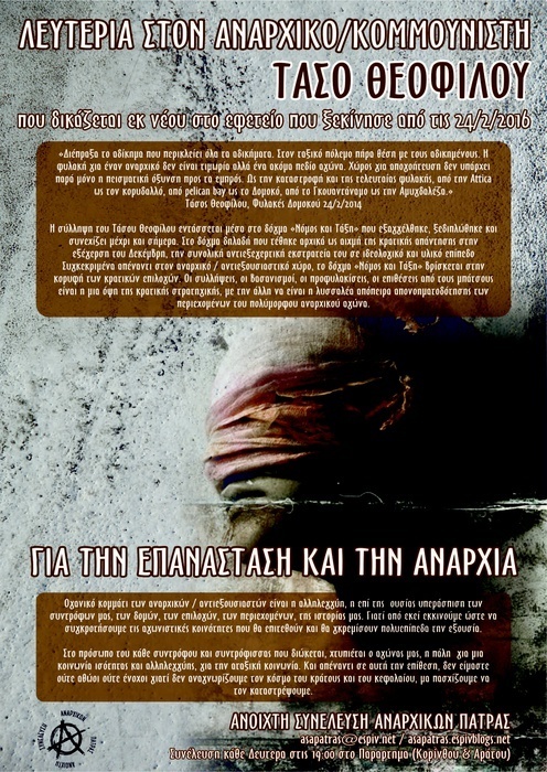 Ανοιχτό κάλεσμα για συντονισμό δράσεων αλληλεγγύης στον αναρχικό κομμουνιστή Τάσο Θεοφίλου. Η δίκη της συγκεκριμένης υπόθεσης σε λίγο καιρό θα φτάσει στο τέλος της, έτσι καλούμε την Πέμπτη 27/3 στις 20:00 στο Παράρτημα συνέλευση για να συζητήσουμε από κοινού τον συντονισμό δράσεων αλληλεγγύης.