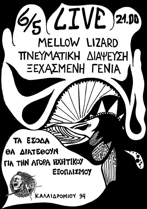 Αυτό το Σάββατο 6/5 ψυχεδελιάζουμε και κοπανιόμαστε με τους Mellow Lizard από Κρήτη μεριά, τους Πνευματική Διάψευση - Spiritual Contradiction και τους Ξεχασμένη Γενιά από Αθήνα!