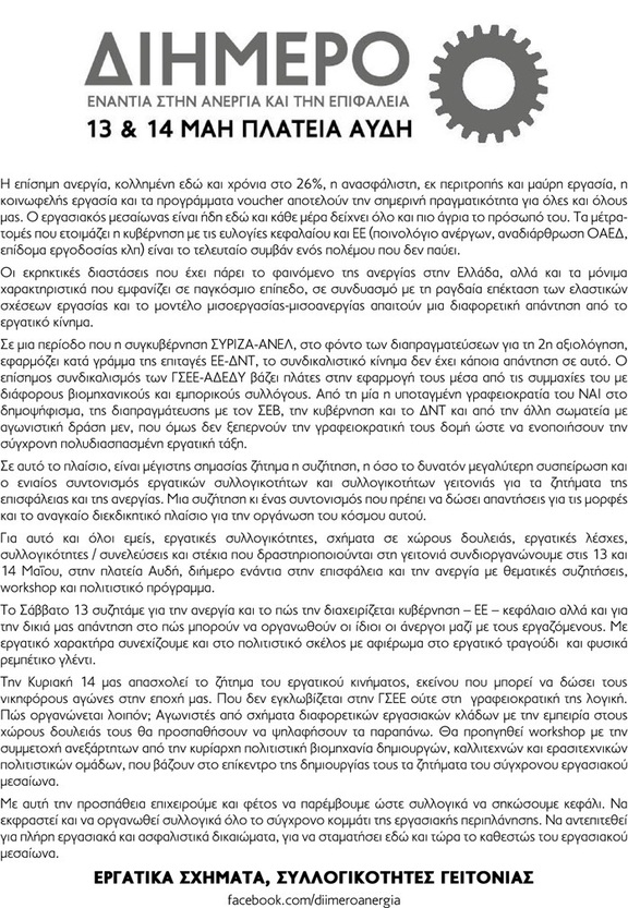 Το κάλεσμα για το διήμερο ενάντια στην ανεργία και την επισφάλεια σε μορφή pdf
