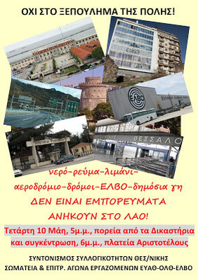 "Γενικό ξεπούλημα" κήρυξε η κυβέρνηση για να ικανοποιήσει τις εντολές της Ε.Ε. και τις ορέξεις του μεγάλου κεφαλαίου ντόπιου και ξένου, με τη Θεσσαλονίκη να έχει την τιμητική της σ' αυτό: μετά τα αεροδρόμια και την αποικιακή σύμβαση με τη Fraport, ήρθε η σειρά του λιμανιού με το ξεπούλημα στο Σαββίδη και τα γαλλογερμανικά συμφέροντα και ακολουθούν στο αμέσως επόμενο διάστημα η ΕΥΑΘ και το νερό της πόλης και η Ελληνική Βιομηχανία Οχημάτων (ΕΛΒΟ) ενώ με ταχύρυθμες διαδικασίες προβλέπεται να προχωρήσει και η παραχώρηση στα ιδιωτικά συμφέροντα του ρεύματος, με το ξεπούλημα των τμημάτων που διασπάται η ΔΕΗ, αλλά και του οδικού δικτύου, με την ΕΓΝΑΤΙΑ ΟΔΟ Α.Ε. Στα σχέδια τους βέβαια πάντα υπάρχουν και τα φιλέτα της δημόσιας γης, των ελεύθερων χώρων και της υποδομής της πόλης που έχουν περάσει στο "Υπερταμείο" και που ορέγονται ξένα και ντόπια μεγάλα συμφέροντα, όπως και η λαϊκή κατοικία και περιουσία που με πλειστηριασμούς και κατασχέσεις προσπαθούν να βάλουν στο χέρι.