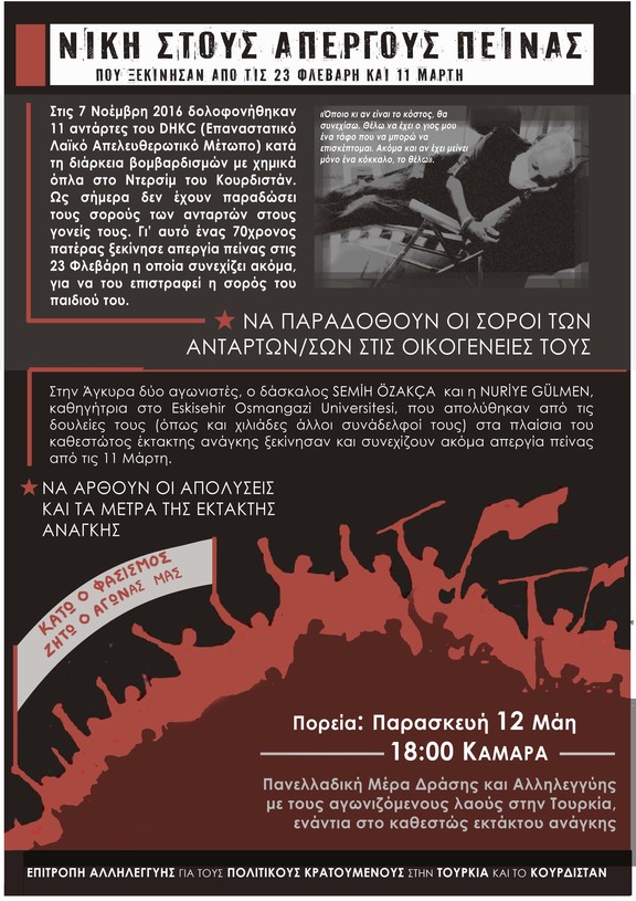 Ένας 70χρονος πατέρας ξεκίνησε αγώνα για το ανθρώπινο δικαίωμά του να ενταφιάσει τη σορό του παιδού του. Για αυτόν το λόγο, σε συμπαράσταση στον αγώνα του, ως Επιτροπή Αλληλεγγύης στους πολιτικούς κρατούμενους στην Τουρκία και το Κουρδιστάν, σ