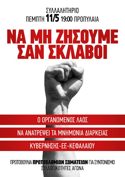 - Καλούμε σε παλλαϊκό συλλαλητήριο την Πέμπτη 11/5 στις 7.00 μμ στα Προπύλαια και πορεία στο Υπουργείο Εργασίας και τη Βουλή, ενάντια στα νέα μέτρα σφαγή, τη συμφωνία κυβέρνησης-ΕΕ-ΔΝΤ και συνολικά ενάντια στην αντιλαϊκή πολιτική της κυβέρνησης και της εργοδοσίας.
