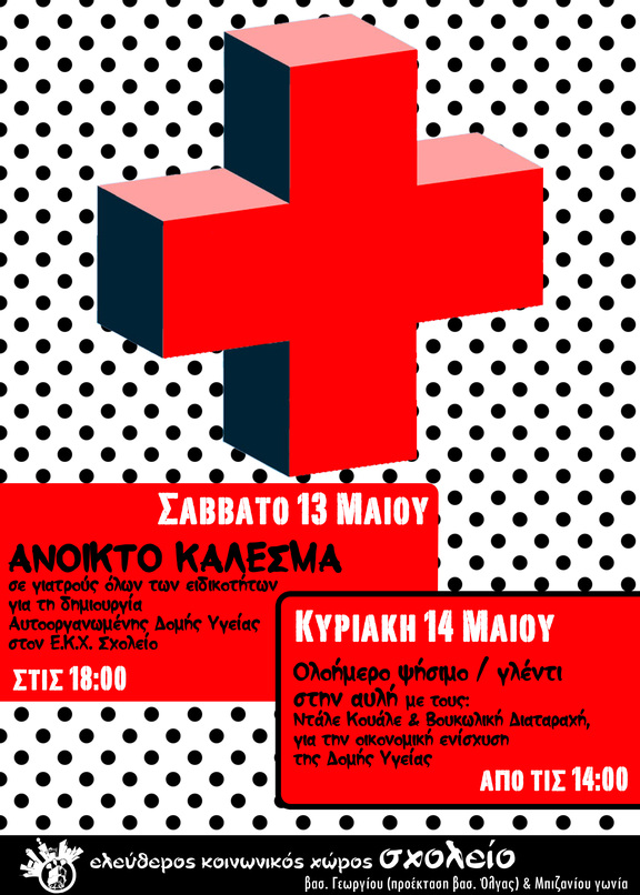 Για την πραγμάτωση του παραπάνω εγχειρήματος καλούμε γιατρούς και ειδικότητες του υγειονομικού κλάδου να συμμετέχουν στη συνδιαμόρφωση και τη λειτουργία του, με πρώτη συνάντηση το Σάββατο 13 Μαΐου στις 19:00 για να συζητήσουμε, να ακούσουμε και να καταθέσουμε απορίες και προβληματισμούς, να δούμε το χώρο και να αυτοοργανώσουμε τις ανάγκες μας.
