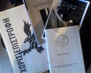 οι μπροσούρες:"Λόγια Συνομωσίας",ΤΟ ΑΝΑΜΜΕΝΟ ΦΥΤΙΛΙ - ΕΞΕΓΕΡΤΙΚΟΣ ΑΝΑΡΧΙΣΜΟΣ - Η ΠΡΑΞΗ ΣΤΗ