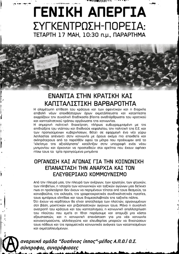 Από την πλευρά μας, την πλευρά των ανέργων, των εργατών, των φτωχών, των πληβείων, η ιστορία των κοινωνικών και ταξικών αγώνων μας δείχνει πως οι προλετάριοι δεν έχουν να περιμένουν τίποτα από τους θεσμούς, τα κοινοβούλια, τις εκλογές, τις γραφειοκρατικές συνδικαλιστικές ηγεσίες, τους εμπόρους ελπίδας και τους διαμεσολαβητές της ταξικής πάλης. Ότι έχουν να κερδίσουν θα είναι αποτέλεσμα των πλατιών, οργανωμένων στη βάση, μαχητικών και ριζοσπαστικών αγώνων τους. Μόνο η συνολική ανατροπή του κράτους και του καπιταλισμού, η κοινωνική απαλλοτρίωση του πλούτου που εμείς οι ίδιοι παράγουμε και απομυζά μια κάστα εξουσιαστών, και η κοινωνική επανάσταση για μια νέα κοινωνία κοινοκτημοσύνης, αλληλεγγύης και ελευθερίας μπορούν να δικαιώσουν τους πόθους και τις πραγματικές κοινωνικές ανάγκες των καταπιεσμένων και εκμεταλλευόμενων.