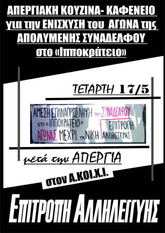 Τσιπουροκαφενείο και συλλογική κουζίνα οικονομικής ενίσχυσης για δικαστικά έξοδα στον αγώνα που δινει η απολυμένη συνάδελφος και η επιτροπή αλληλεγγύης στο ιδιωτικό διαγνωστικό κέντρο Ιπποκράτειο Ιωαννίνων, ώστε να παρθεί πίσω η άδικη και καταχρηστική απόλυσή της