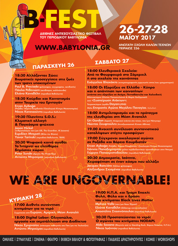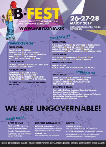 Το φετινό B-FEST φιλοδοξεί να αναδείξει ιδέες, κινήματα, κοινότητες και κοινωνίες που καθίστανται μη διαχειρίσιμες και μη κυβερνήσιμες στα διάκενα του υπάρχοντος παγκόσμιου ολιγαρχικού και καπιταλιστικού συστήματος. "We are ungovernable" είναι το φετινό σύνθημα του φεστιβάλ στο οποίο μεταξύ άλλων θα συμμετέχουν ο Γάλλος πολιτικός φιλόσοφος Ζακ Ρανσιέρ, o Αldo Seoane ιθαγενής Ινδιάνος αγωνιστής από την Ντακότα των ΗΠΑ, ο Ercan Ayboga από το οικολογικό κίνημα της Μεσοποταμίας (Ροζάβα), ο Peter Sunde ιδρυτής του Pirate Bay, η Melissa Valle για το κίνημα Black Lives Matter, ο Jason Hickel ανθρωπολόγος και αρθρογράφος του The Guardian, Al Jazeera, o Uri Gordon από τους ισραηλινούς αναρχικούς ενάντια στο τείχος, κινήματα που υπερασπίζονται τα κοινά αγαθά από την Ελλάδα και το εξωτερικό, ενώ θα διοργανωθεί και η διεθνής συνάντηση κινημάτων για το νερό.